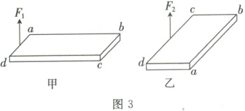 如图3甲所示,将一块厚度、密度均匀,质量为$m$的长方形水泥板放在水平地面上,用竖直向上的拉力$F_1$(作用在$ad$端中点)将水泥板$ad$端缓缓抬离地面,$F_1$的大小为$\underline{\hspace{2cm}}$;如图3乙所示,撤去$F_1$后接着用竖直向上的拉力$F_2$(作用在$cd$端中点)将$cd$端缓缓抬离地面,则$F_1\underline{\hspace{1cm}}F_2$。分别用力作用在$ad$、$cd$端中点,将水泥板缓缓拉至竖直位置,不计空气阻力等因素,两次拉力做的功$W_1\underline{\hspace{1cm}}W_2$。(后两空均选填“$>$”“$<$”或“$=$”)