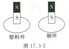 3. 如图17.3-2所示,条形磁铁从相同高度自由下落,分别穿过闭合的塑料环和铜环。磁铁刚穿过铜环时的机械能比刚穿过塑料环时的机械能小,原因是磁铁在穿过铜环时发生了