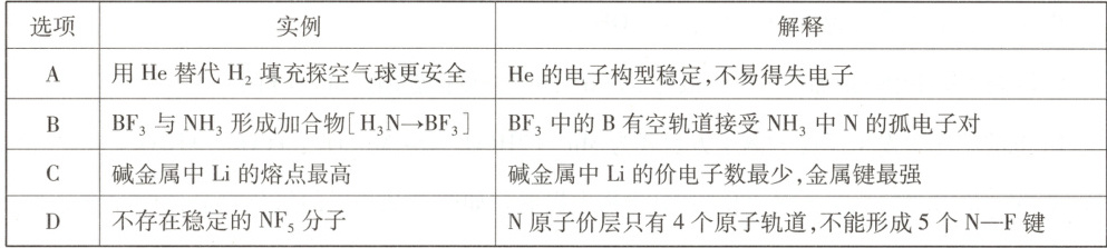 解题思路 氦气是一种惰性气体,不易燃烧或爆炸,因此使用电子构型稳定,不易得失电子的$ He$填充探空气球更加安全可靠,而氢气具有可燃性,使用氢气填充探空气球存在一定的安全隐患,A项正确。三氟化硼分子中硼原子具有空轨道,能与氨分子中具有孤电子对的氮原子形成配位键,所以三氟化硼能与氨分子形成加合物$[ H_3 N\rightarrow BF_3]$,B项正确。金属键的强弱取决于价电子数和原子半径。碱金属元素的价电子数相等,$ Li$的原子半径在碱金属中最小,形成的金属键最强,所以碱金属中锂的熔点最高,C项错误。$ N$原子的价层只有4个原子轨道,只能形成4条共价键,由共价键的饱和性可知,氮原子不能形成5个$ N—F$键,所以不存在稳定的$ NF_5$分子,D项正确。