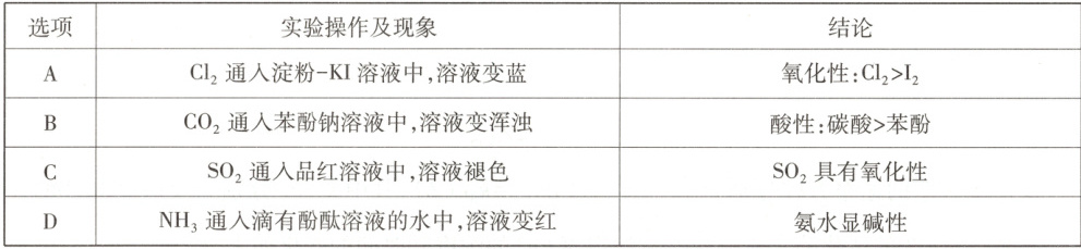 解题思路 $ Cl_2$和$ KI$发生反应$ Cl_2+2 KI= I_2+2 KCl$,淀粉遇碘单质变蓝色,根据氧化剂的氧化性强于氧化产物的氧化性可知,氧化性$ Cl_2> I_2$,A项正确。常温下,苯酚在水中的溶解度很小,将$ CO_2$通入苯酚钠溶液中,溶液变浑浊,说明有苯酚生成,由强酸制弱酸原理可知,酸性碳酸>苯酚,B项正确。$ SO_2$通入品红溶液中,$ SO_2$与品红溶液反应生成不稳定的无色物质,使品红溶液褪色,体现$ SO_2$的漂白性,C项错误。$ NH_3$与水反应$ NH_3+ H_2 O\rightleftharpoons NH_3· H_2 O$,$ NH_3· H_2 O$电离出$ OH^-$,使酚酞变红,氨水显碱性,D项正确。