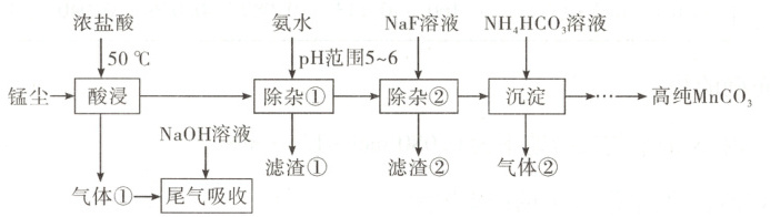 $ Mn_3 O_4$中含有+4价$ Mn$,与浓盐酸反应生成氯气,其余的金属氧化物均反应生成可溶氯化物,即气体①为氯气,A项正确。加入氨水调节pH为5~6,结合题目所给$K_{ sp}$可以计算$ Fe^{3+}$、$ Al^{3+}$可转化为$ Fe(OH)_3$、$ Al(OH)_3$沉淀除去,B项正确。除杂②加入$ NaF$溶液可以除去$ Ca^{2+}$和$ Mg^{2+}$,由于$ MgF_2$和$ CaF_2$结构相似,$K_{ sp}$大小为$ MgF_2< CaF_2$,所以$ Ca^{2+}$、$ Mg^{2+}$浓度接近时$ Mg^{2+}$先沉淀,C项错误。沉淀工序中,加入$ NH_4 HCO_3$溶液,$ Mn^{2+}$结合$ HCO_3^-$电离出的$ CO_3^{2-}$转化为$ MnCO_3$,剩余的$ H^+$与$ HCO_3^-$反应生成$ CO_2$和$ H_2 O$,故发生反应$ Mn^{2+}+2 HCO_3^-= MnCO_3\downarrow+ CO_2\uparrow+ H_2 O$,D项正确。