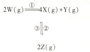 解题思路 该气相反应体系中,有三个化学反应共存,反应②和反应③互为逆反应。W和Y只参与了反应①,X和Z同时参与了①②③三个反应。其中反应②为气体分子数减小的反应,反应③为气体分子数增大的反应。由表可知,0~2 min内,$\Delta c( W)=0.080\ mol· L^{-1}$,反应①生成$\Delta c( X)=2\Delta c( W)=0.160\ mol· L^{-1}$,X同时参与了①②③三个反应,其平均反应速率由三个反应共同决定,则$\Delta c( X)\neq0.160\ mol· L^{-1}$,即0~2 min内,X的平均反应速率不为$0.080\ mol· L^{-1}· min^{-1}$,A项错误。过程①是完全反应,过程②是可逆反应,改变容器的体积,只对过程②有影响,对过程①生成Y的反应无影响,平衡时Y的产率不变,B项错误。X和Z的反应是可逆反应,达平衡时,正、逆反应速率相等,即$v_2=v_3$,若$k_2=k_3$,则$c( Z)=c^2( X)$,C项错误。反应③的活化能大于反应②,则$\Delta H=$正反应活化能-逆反应活化能$<0$,即$4 X(g)\rightleftharpoons2 Z(g)\ \ \Delta H<0$,升高温度,平衡逆向移动,平衡时,$c( Z)$减小,D项正确。