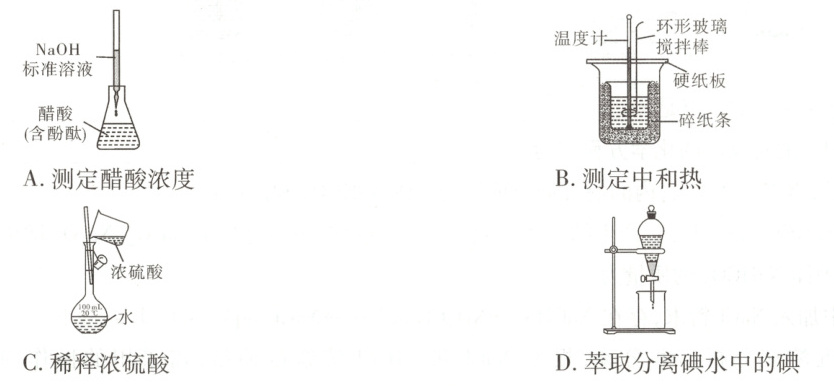 解题思路 可用${NaOH}$标准溶液通过滴定的方法测定醋酸溶液的浓度,由于完全反应后溶液呈碱性,故可用酚酞溶液确定滴定终点,A项正确。测定中和热时,温度计不能接触烧杯底部,两个烧杯口应在同一高度,两个烧杯之间应填满碎纸条,以减少热量损失等,B项错误。浓硫酸溶于水放热,应在烧杯中稀释,C项错误。分液时分液漏斗的下端应紧贴烧杯壁,D项错误。