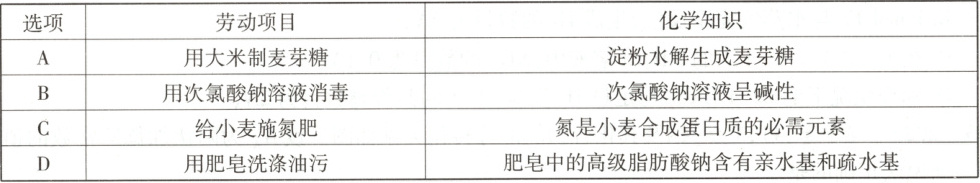 命题意图本题结合劳动项目与化学知识,考查次氯酸钠消毒原理、氮肥作用、肥皂除油污等生活应用,体现了"科学态度与社会责任"等化学学科核心素养。