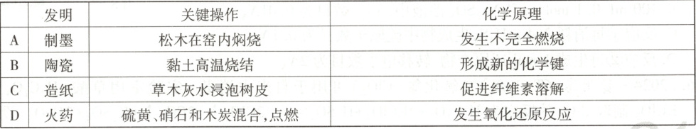 解题思路松木在窑中不完全燃烧会生成碳单质,可以用来制墨,A项正确。黏土在高温中烧结,会发生一系列的化学反应,此过程有新化学键的形成,B项正确。草木灰主要成分为碳酸钾,其溶液呈碱性,与木质素反应生成可溶性的碱木质素,将其从原料中脱除,此过程中纤维素未溶解,C项错误。中国古代黑火药是由硫黄、硝石、木炭混合而成的,在点燃时发生剧烈的氧化还原反应,反应的化学方程式为S+2KNO₃+3C=K₂S+3CO₂↑+N₂↑,D项正确。