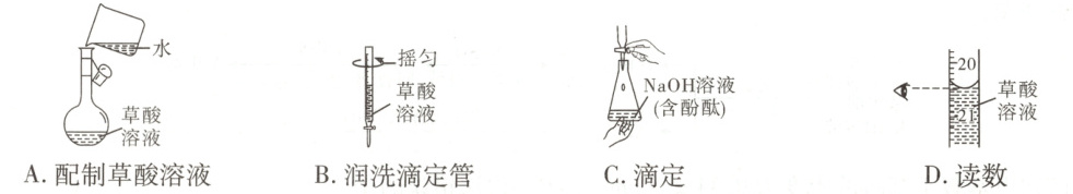 解题思路 向容量瓶中转移溶液时需要用玻璃棒引流,A项错误。润洗滴定管时应取少量草酸溶液于滴定管中,倾斜着转动滴定管,使液体润湿全部滴定管内部,B项错误。滴定时,如图