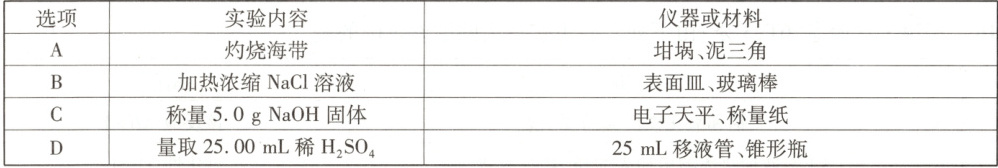 解题思路 灼烧海带需在坩埚中进行,泥三角用于支撑坩埚在三脚架(或带铁圈的铁架台)上加热,A项正确。加热浓缩NaCl溶液时,应使用蒸发皿和玻璃棒,表面皿不能直接加热,B项错误。NaOH易潮解且腐蚀性强,称量时应置于烧杯或称量瓶中,C项错误。量取25.00mL的稀H₂SO₄可以用25mL的移液管量取,并移入锥形瓶中,D项正确。