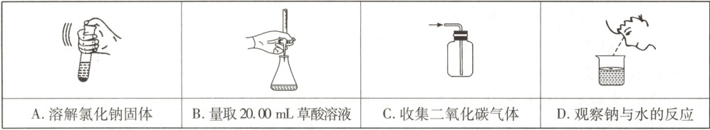 解题思路 溶解氯化钠固体一般在烧杯中进行,如果在试管中溶解少量氯化钠固体,应敞口轻轻振荡试管使氯化钠固体溶解,不能用拇指堵住试管口上下振荡,A项错误。滴定管能精确到0.01mL,量取20.00mL草酸溶液,可以使用酸式滴定管,该实验操作符合规范,B项正确。二氧化碳的密度比空气大,收集二氧化碳可用向上排空气法,但不能没有出气导管,会使瓶内压强过大,容易发生爆炸,C项错误。钠与水的反应比较剧烈,而且产生的氢氧化钠有腐蚀性,不能近距离俯视烧杯且应佩戴护目镜、在远处观察,D项错误。