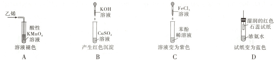 解题思路 乙烯中含有碳碳双键,能被酸性KMnO₄氧化,从而使酸性KMnO₄溶液褪色,A项正确。KOH与CuSO₄发生复分解反应,生成Cu(OH)₂蓝色沉淀,B项错误。苯酚遇FeCl₃发生显色反应,溶液变为紫色,C项正确。浓氨水挥发出的NH₃可使湿润的红色石蕊试纸变为蓝色,D项正确。