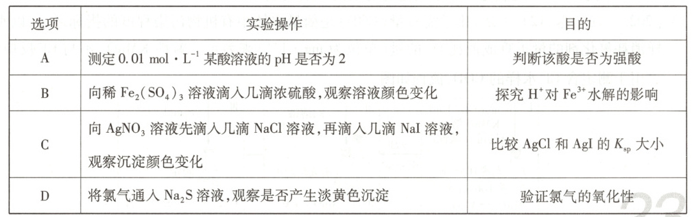 解题思路 若该酸为一元酸,0.01mol·L⁻¹某酸溶液的pH = 2,可判断该酸为强酸,但某些多元弱酸,浓度为0.01mol·L⁻¹时也可能达到pH = 2,故无法判断该酸是否为强酸,A项错误。向稀Fe₂(SO₄)₃溶液中滴加浓硫酸,虽增加H⁺浓度抑制Fe³⁺水解,但浓硫酸稀释时放热,未控制变量,无法单独验证H⁺的影响,B项错误。AgNO₃溶液过量,溶液中剩余的Ag⁺会直接与I⁻生成AgI沉淀,无法证明AgCl转化为AgI,故不能比较二者Ksp,C项错误。Cl₂与Na₂S反应生成淡黄色沉淀S,证明Cl₂将S²⁻氧化为S,验证了Cl₂的氧化性,D项正确。