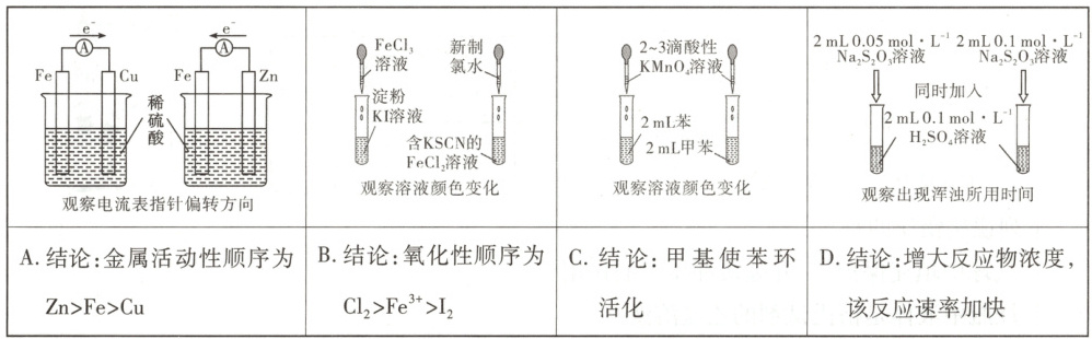 解题思路 Fe、Cu、稀硫酸原电池中,电子由金属Fe流向Cu,则Fe作负极,Cu作正极,金属活动性顺序Fe>Cu;Fe、Zn、稀硫酸原电池中,电子由Zn流向Fe,则Zn作负极,Fe作正极,金属活动性顺序Zn>Fe,综合分析,金属活动性顺序Zn>Fe>Cu,A项正确。FeCl₃与淀粉KI溶液反应,溶液变蓝色,则说明生成I₂,氧化性Fe³⁺>I₂;新制氯水加入含KSCN的FeCl₂溶液中,溶液变红色,说明生成了Fe³⁺,则氧化性Cl₂>Fe³⁺,故氧化性Cl₂>Fe³⁺>I₂,B项正确。酸性KMnO₄溶液分别滴入苯和甲苯中,苯不能使酸性KMnO₄溶液褪色,甲苯能被酸性KMnO₄溶液氧化为苯甲酸而使之褪色,说明甲苯能使甲基活化,C项错误。不同浓度的Na₂S₂O₃溶液与相同浓度的稀硫酸反应,浓度大的Na₂S₂O₃溶液先出现浑浊,说明增大反应物浓度,反应速率加快,D项正确。
