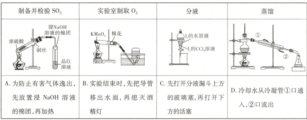 解题思路 蒸馏时,为了更好地冷凝效果,冷凝水应“下进上出”,即②口通入,①口流出,D项错误。