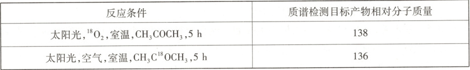 (5)为保证${^{18}O_{2}}$气氛,通${^{18}O_{2}}$前,需先使用“循环冷冻脱气法”排出装置中(空气中和溶剂中)的${^{16}O_{2}}$,由于丙酮易挥发,故应先用液氮冷冻丙酮,再抽出${^{16}O_{2}}$,然后关闭阀门,恢复室温,使${^{16}O_{2}}$排出,所以操作顺序为①$\to$②$\to$③$\to$①$\to$④,重复后四步操作数次。使用${^{18}O_{2}}$、${CH_{3}COCH_{3}}$得到的目标产物相对分子质量为$138$,使用空气、${CH_{3}C^{18}OCH_{3}}$得到的目标产物相对分子质量为$136$,说明目标产物中羧基${O}$来源于醛基和氧气。