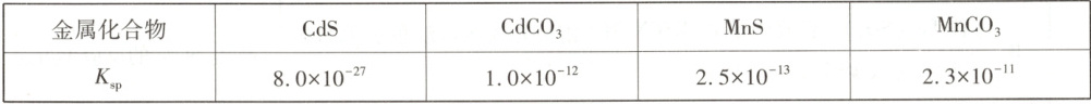 解题思路 粉碎工业废料能增大废料与浸出液的接触面积,有利于提高金属元素的浸出率,A项正确。富集液中含有的${Cd^{2+}}$、${Mn^{2+}}$,其浓度相当,加入适量试剂“X”沉镉”,由金属化合物的$K_{ sp}$可知,${CdCO_{3}}$、${MnCO_{3}}$的$K_{ sp}$接近,不易分步沉淀,则试剂X应选择含${S^{2-}}$的试剂,得到${CdS}$滤饼,即试剂X可以是${Na_{2}S}$溶液,B项正确。若先加入${NaHCO_{3}}$溶液进行“沉锰”,会同时生成${CdCO_{3}}$、${MnCO_{3}}$,不能实现二者分离,故“沉镉”和“沉锰”的顺序不能对换,C项正确。“沉锰”时,发生反应的离子方程式为${Mn^{2+} + 2HCO^{-}_{3} = MnCO_{3}↓ + CO_{2}↑ + H_{2}O}$,D项错误。