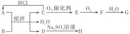 2. [2025·湖北卷,8T,3 分]如图所示的物质转化关系中,固体 A 与固体 B 研细后混合,常温下搅拌产生气体 C 和固体 D,温度迅速下降。气体 C 能使湿润的红色石蕊试纸变蓝。G 是一种强酸。H 是白色固体,常用作钡餐。下列叙述错误的是(