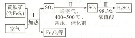 解题思路 根据原理示意图可知,黄铁矿(含 ${FeS_{2}}$)在空气中加热生成 ${SO_{2}}$、${Fe_{3}O_{4}}$,A 项正确。反应Ⅱ条件要兼顾平衡转化率和反应速率,还要考虑生产成本,如Ⅱ中“常压”主要是从生产成本方面考虑,“通空气”可使平衡正向移动,提高 ${SO_{2}}$ 平衡转化率,“$400\sim 500^{\circ} C$、催化剂”是为了提高反应速率,B 项错误。将黄铁矿换成硫黄,则发生的反应为 ${S + O_{2} \xlongequal{ 点燃} SO_{2}}$,不再产生 ${Fe_{3}O_{4}}$,即可以减少废渣产生,C 项正确。硫酸工业产生的尾气为 ${SO_{2}}$、${SO_{3}}$,两者均为酸性气体,均可以用碱液吸收,D 项正确。