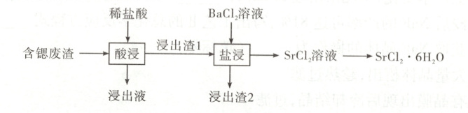 解题思路 含锶(${Sr}$)废渣主要含有${SrSO_{4}}$、${SiO_{2}}$、${CaCO_{3}}$、${SrCO_{3}}$和${MgCO_{3}}$等,加入稀盐酸“酸浸”,碳酸盐溶解进入“浸出液”,“浸出渣1”中含有${SrSO_{4}}$、${SiO_{2}}$,加入${BaCl_{2}}$溶液,发生沉淀转化,得到${SrCl_{2}}$溶液,经过系列操作得到${SrCl_{2}· 6H_{2}O}$晶体。