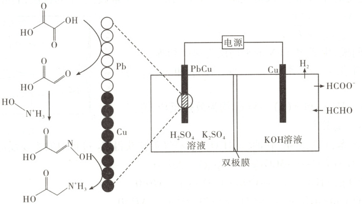 14. [2024·湖北卷,14T,3 分]我国科学家设计了一种双位点 PbCu 电催化剂,用 H₂C₂O₄和 NH₂OH 电化学催化合成甘氨酸,原理如图,双极膜中 H₂O 解离的 H⁺和 OH⁻在电场作用下向两极迁移。已知在 KOH 溶液中,甲醛转化为 HOCH₂⁻,存在平衡 HOCH₂⁻ + OH⁻ $\xlongequal{}$ [OCH₂O]²⁻ + H₂O。Cu 电极上发生的电子转移反应为[OCH₂O]²⁻ - e⁻ $\xlongequal{}$ HCOO⁻ + H·。下列说法错误的是(