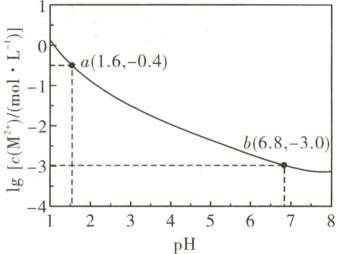 7. [2025·安徽卷,14T,3 分]H₂A 是二元弱酸,M²⁺不发生水解。25℃时,向足量的难溶盐 MA 粉末中加入稀盐酸,平衡时溶液中 lg[c(M²⁺)/(mol·L⁻¹)]与 pH 的关系如下图所示。