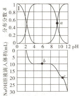 解题思路随着${pH}$增大,平衡${^{+}NH_{3}CH_{2}COOH \underset{\lower{7mu}{}}{\overset{pK_{1}=2.4}{⇌}} ^{+}NH_{3}CH_{2}COO^{-} \underset{\lower{7mu}{}}{\overset{pK_{2}=9.6}{⇌}} NH_{2}CH_{2}COO^{-}}$右移,${^{+}NH_{3}CH_{2}COOH}$的分布分数减小,${^{+}NH_{3}CH_{2}COO^{-}}$的分布分数先增大后减小,${NH_{2}CH_{2}COO^{-}}$的分布分数增大,则曲线Ⅰ代表${^{+}NH_{3}CH_{2}COOH}$的分布分数,A项正确。$a$点代表${^{+}NH_{3}CH_{2}COO^{-}}$和${NH_{2}CH_{2}COO^{-}}$分布分数相等的点,即二者浓度相等,$pK_{2} = 9.6$,$K_{2} = \dfrac{c{(NH_{2}CH_{2}COO^{-})} · c{(H^{+})}}{c{(^{+}NH_{3}CH_{2}COO^{-})}} = c{(H^{+})} = 10^{-9.6}$,则$a$点处对应的${pH}$为$9.6$,B项正确。$b$点滴入$0.1 \ mol· L^{-1} \ {NaOH}$溶液为$10 \ mL$,${^{+}NH_{3}CH_{2}COOH· Cl^{-}}$和${NaOH}$的物质的量相等,得到的溶液中的溶质为等浓度的${^{+}NH_{3}CH_{2}COO^{-}}$和${NaCl}$,${^{+}NH_{3}CH_{2}COO^{-}}$在溶液中存在电离和水解,$K_{2} = 10^{-9.6}$,$K_{ h} = \dfrac{K_{ w}}{K_{1}} = \dfrac{10^{-14}}{10^{-2.4}} = 10^{-11.6} < K_{2}$,即电离程度大于水解程度,则$c{(^{+}NH_{3}CH_{2}COOH)} < c{(NH_{2}CH_{2}COO^{-})}$,C项错误。$c$点${^{+}NH_{3}CH_{2}COOH· Cl^{-}}$和${NaOH}$的物质的量之比为$1:2$,此时溶液中的溶质为等浓度的${NH_{2}CH_{2}COONa}$和${NaCl}$,根据质子守恒,有$2c{(^{+}NH_{3}CH_{2}COOH) + c(^{+}NH_{3}CH_{2}COO^{-}) + c(H^{+}) = c(OH^{-})}$,D项正确。