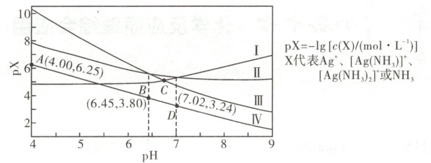解题思路${NH^{+}_{4}}$在水溶液中会发生水解,${NH^{+}_{4} + H_{2}O⇌ NH_{3}· H_{2}O + H^{+}}$,${NH_{3}· H_{2}O⇌ NH_{3} + H_{2}O}$,随溶液的${pH}$的增大,${NH^{+}_{4}}$的水解平衡正向移动,${NH_{3}}$浓度增大,$p{NH_{3}}$减小,结合$K_{ h}{(NH^{+}_{4})} = 10^{-9.25}$和${A}$点坐标,则Ⅳ为${NH_{3}}$的变化曲线。${NH_{3}}$浓度增大,使${[Ag(NH_{3})]^{+}}$、${[Ag(NH_{3})_{2}]^{+}}$浓度增大,${Ag^{+}}$浓度减小,则$p{[Ag(NH_{3})]^{+}}$、$p{[Ag(NH_{3})_{2}]^{+}}$减小,$p{Ag^{+}}$增大。当初始${pH}$较小时,$c{(NH_{3})}$较小,$c{([Ag(NH_{3})]^{+})} > c{([Ag(NH_{3})_{2}]^{+})}$,则$p{[Ag(NH_{3})]^{+}}$小于$p{[Ag(NH_{3})_{2}]^{+}}$,故曲线Ⅰ、Ⅱ、Ⅲ分别代表${Ag^{+}}$、${[Ag(NH_{3})]^{+}}$、${[Ag(NH_{3})_{2}]^{+}}$的变化曲线,A项正确。${NH^{+}_{4}}$在水溶液中会发生水解,$c{(NH^{+}_{4})} < 0.1 \ mol· L^{-1}$,${D}$点时溶液${pH} = 7.02$,显碱性,即$c{(OH^{-})} > c{(H^{+})}$,故$c{(NH^{+}_{4})} - c{(OH^{-})} < 0.1 - c{(H^{+})}$,B项错误。根据图像可知,${D}$点时$c{([Ag(NH_{3})]^{+})} = c{(Ag^{+})}$,此时$c{(NH_{3})} = 10^{-3.24} \ mol· L^{-1}$,则$K_{1} = \dfrac{c{([Ag(NH_{3})]^{+})}}{c{(Ag^{+})} · c{(NH_{3})}} = 10^{3.24}$,C项正确。${B}$点时,$c{([Ag(NH_{3})_{2}]^{+})} = c{([Ag(NH_{3})]^{+})}$,$c{(NH_{3})} = 10^{-3.80} \ mol· L^{-1}$,所以反应${[Ag(NH_{3})]^{+} + NH_{3}⇌ [Ag(NH_{3})_{2}]^{+}}$的平衡常数为$10^{3.80}$,则$K_{2} = 10^{3.24} × 10^{3.80} = 10^{7.04}$,${C}$点时,$c{([Ag(NH_{3})_{2}]^{+})} = c{(Ag^{+})}$,所以$c{(NH_{3})} = \sqrt{\dfrac{10^{-7.04}}{10^{3.24}}} \ mol· L^{-1} = 10^{-5.12} \ mol· L^{-1}$,D项正确。