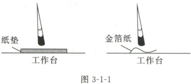 图3-1-1所示的是金箔铺贴过程,工匠手持毛刷在纸垫上来回扫过,再将毛刷靠近工作台上的金箔时,可将金箔吸起来。毛刷与纸垫摩擦后,由于