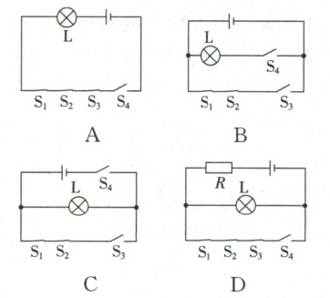 (2)小明对用来提醒司机是否关好车门的指示灯系统很感兴趣。他查阅资料发现当四个车门中只要有一个门没关好(相当于一个开关断开),指示灯就会发光。下列模拟电路图符合要求的是(