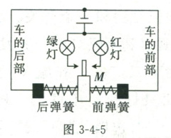 (4)小明翻阅了汽车说明书,里面提到汽车中有如图3-4-5所示的电路,其中上端带金属细杆的金属滑块$M$与两侧金属弹簧相连接并接入电路中,金属滑块$M$与弹簧套在光滑绝缘的水平细杆上,当汽车静止时,如图所示。当汽车向前启动时,