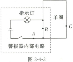 5. 如图3-4-3所示,一名工程师为牧羊人设计了一个羊圈警报器,其效果是用细导线将羊圈围住,合上开关,当羊在圈内吃草时,电路中只有指示灯亮而电铃不响;当有羊碰断了圈住羊圈的细导线到圈外时,电铃便会响起来,牧羊人能及时发现。电铃应安装在图中的