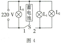 4. 图 4 是一款消防应急照明灯的简化原理图,有两只应急灯泡 $L_1$、$L_2$。当外部电源供电时,自动开关 S 接 1,应急灯不亮,蓄电池此时在电路中相当于
