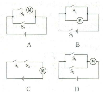 6. 喜爱物理的小明想设计一个双钥匙电动安全锁,这里的钥匙相当于“开关”,要求是两把钥匙同时使用(“开关”闭合)才能开锁。下列电路设计符合要求的是(