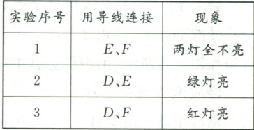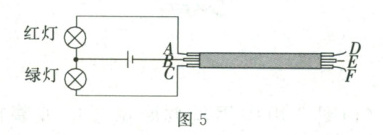 5. 如图 5 所示,在一根硬塑料管内穿有三根完全相同的电线,为了辨别哪两个线头为同一根导线的两端,采用如下方法测试,其操作过程如下:取两只颜色不同的小灯泡接入电路,分别用导线连接$D、E、F$。通过观察现象(如下表所示)可判断 $A$ 和