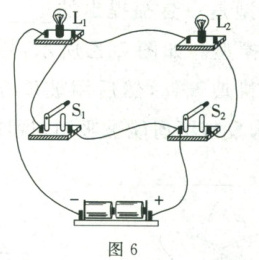 7. 小明在做实验时连接成了如图 6 所示的电路:闭合开关 $S_1$,观察灯泡的发光情况;再闭合开关 $S_2$,观察灯泡的发光情况。小明观察到的现象是(