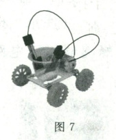 8. (多选)跨学科活动小组组装了图 7 所示的一辆“盐水动力”玩具车,车身上方固定了一个小塑料杯,塑料杯壁内侧有一片镁片和一片碳片,当向杯中倒入盐水,使镁片和碳片都浸入盐水中时,小车就能缓缓向前运动。下列说法正确的是(