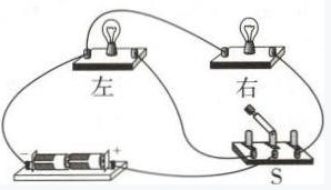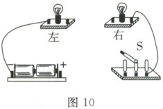 11. 如图 10 所示,左、右两灯分别代表小汽车的左、右转向灯,开关 S 控制左、右两盏转向灯,且开关往左闭合左灯亮,往右闭合右灯亮。请根据题意用笔画线代替导线完成实物图的连接。