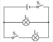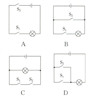 10. 汽车驾驶室内的遮阳板和镜灯如图 9 所示,研究发现遮阳板和镜子移门相当于开关 $S_1$ 和 $S_2$。下翻遮阳板并打开镜子移门(相当于闭合开关 $S_1$ 和 $S_2$),镜灯亮;关闭镜子移门或向上折遮阳板(相当于断开开关 $S_2$ 或 $S_1$),镜灯灭。下列电路设计符合要求的是(