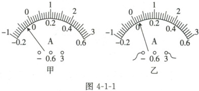 。小莹断开开关,纠正错误后,再闭合开关,发现指针偏转至图4-1-1乙所示的位置,她接下来的操作是断开开关,换接0~0.6A量程