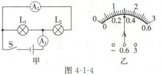 。(2)连接的电路如图4-1-6乙所示,则电流表测的是通过灯