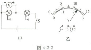 (选填“L₁”“L₂”或“电源”)的电压,电压表的示数如图4-2-2乙所示,则L₂两端的电压为2.4