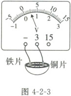 6.取一个橙子,把铜片、铁片插入其中,就制成了一个水果电池。用电压表测量电压,如图4-2-3所示。水果电池此时的电压为