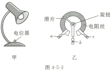 5. 如图4-5-3所示,甲为亮度可调的台灯,电位器是调节其亮度的装置,乙为电位器的内部结构示意图,$a$、$b$、$c$是它的三个接线柱,旋钮带动滑片转动,电位器应与灯泡