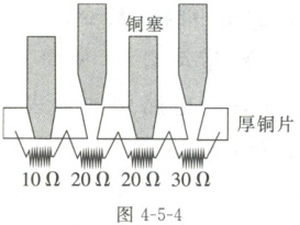 6. 图4-5-4是插塞式电阻箱的示意图,铜塞与厚铜片的电阻很小,可近似认为是$0$。在如图所示的情景中,该电阻箱的有效电阻为