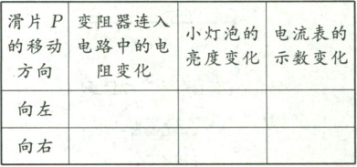 |滑片P的移动方向|变阻器连入电路中的电阻变化|小灯泡的亮度变化|电流表的示数变化|