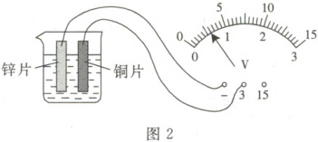 2. 如图 2 所示,在烧杯中加入盐水,然后将连在电压表上的铜片和锌片插入盐水中,这样就制成了一个简易的电池。电压表指针向右偏转至如图所示的位置,由接线可知