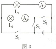 3. 在如图 3 所示的电路中,只闭合开关$S_1$、$S_3$时,灯泡$L_1$、$L_2$是