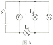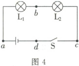 5. 如图 4 所示,闭合开关 S 时,灯泡 $L_1$、$L_2$ 都不亮。用一根导线的两端接触 $a$、$b$ 两点时,两灯也不亮;接触 $b$、$c$ 两点时,两灯仍不亮;接触 $c$、$d$ 两点时,两灯都亮。下列分析正确的是(