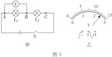 (选填“能”或“不能”)。(5) 测出 $AB$、$BC$、$AC$ 间的电压并记录在下面表格中,其中 $AB$ 间的电压大小如图 9 乙所示,其示数为