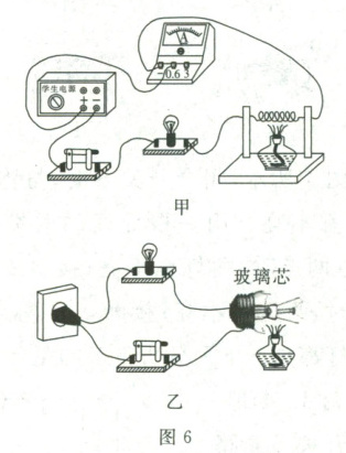 7. (多选)有两个实验:如图 6 甲所示,用酒精灯加热金属丝,加热过程中电流表示数逐渐变小;如图 6 乙所示,将灯丝断开的玻璃芯加热到红炽状态时,灯泡将发光。下列描述这两个实验现象的说法正确的是(