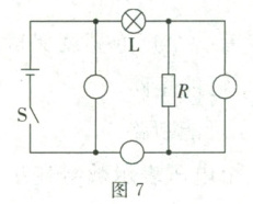 8. 在图 7 中的“〇”里填上电流表或电压表符号,使开关闭合后各电路元件能正常工作。