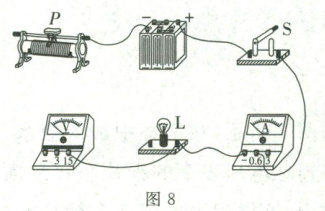 9. 在如图 8 所示的电路中,有两根导线尚未连接,请用笔画线代替导线将电路连接完整。要求:(1) 电压表测灯泡两端的电压;(2) 闭合开关,当滑动变阻器的滑片 $P$ 向右移动时,电流表的示数变大。